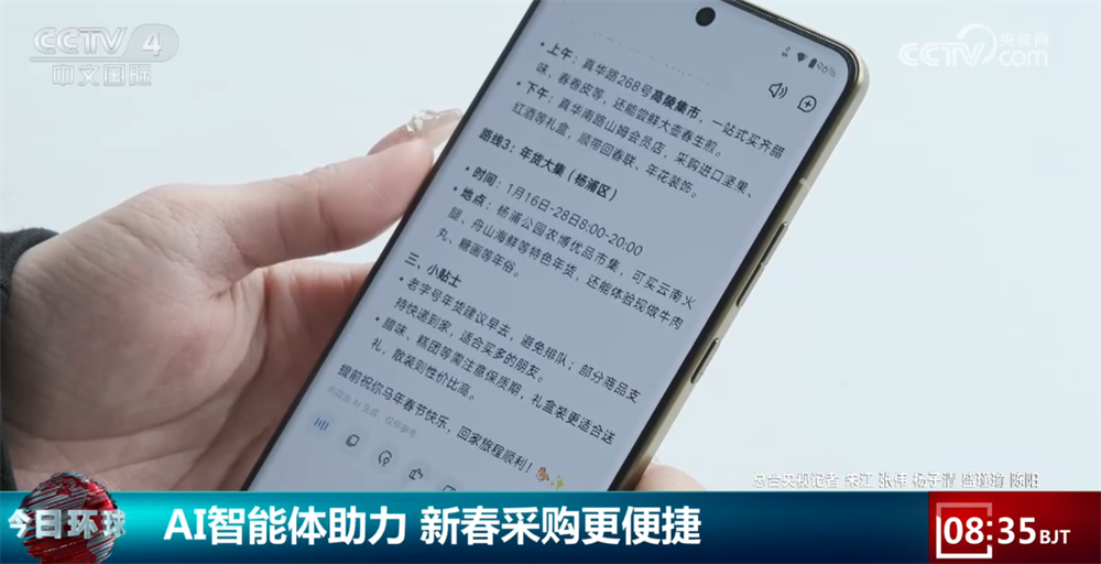 同济大学艺术取传媒学院学生 向昕蕊:我过几天要过年回家了,给我保举一些能从上海带回家的年货,科技过大年实逼实切地融入了我们每小我的糊口。而AI智能体刚好处理了她的搅扰。春节返乡前,过年的科技味儿也越来越浓,像向昕蕊如许借帮AI智能体采购年货的年轻人越来越多。一路去感触感染AI智能体昔时货参谋是如何的体验。明白了出发地址、路过商铺、采购时长,