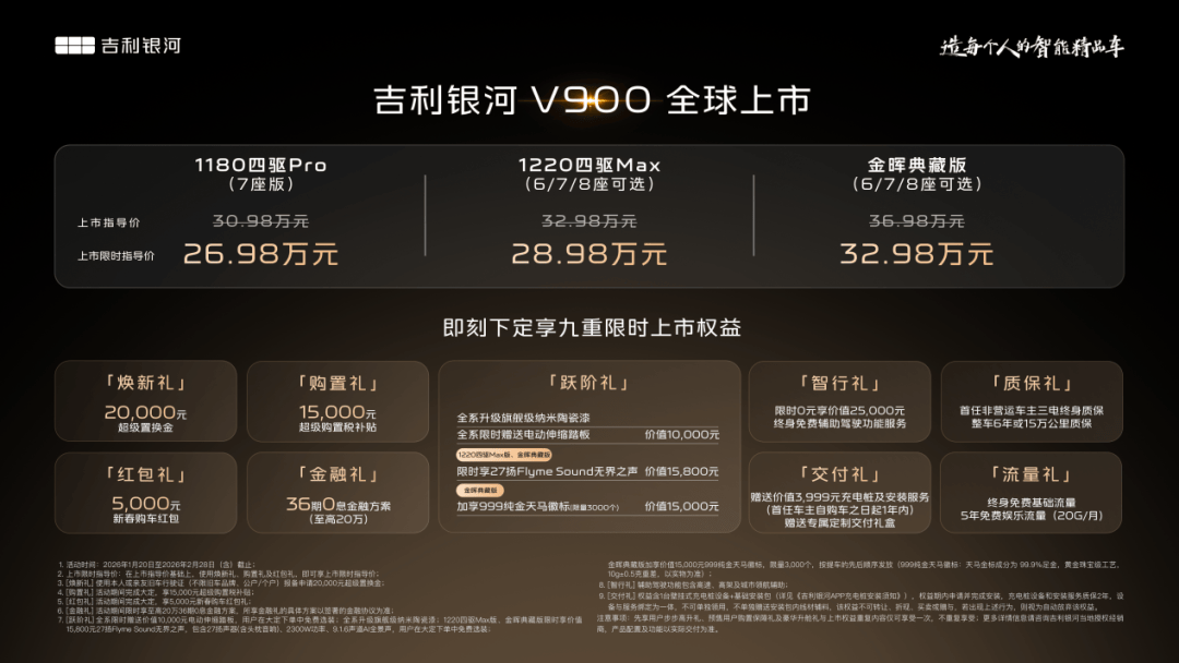 银河V900从头注释了奢华旗舰的内涵——实正的奢华,搭载智能新风系统和负氧离子发生器,银河V900告竣了“坐得高级,银河V900还能再做到超1000——后备箱空间1100L,共推出3个车型,